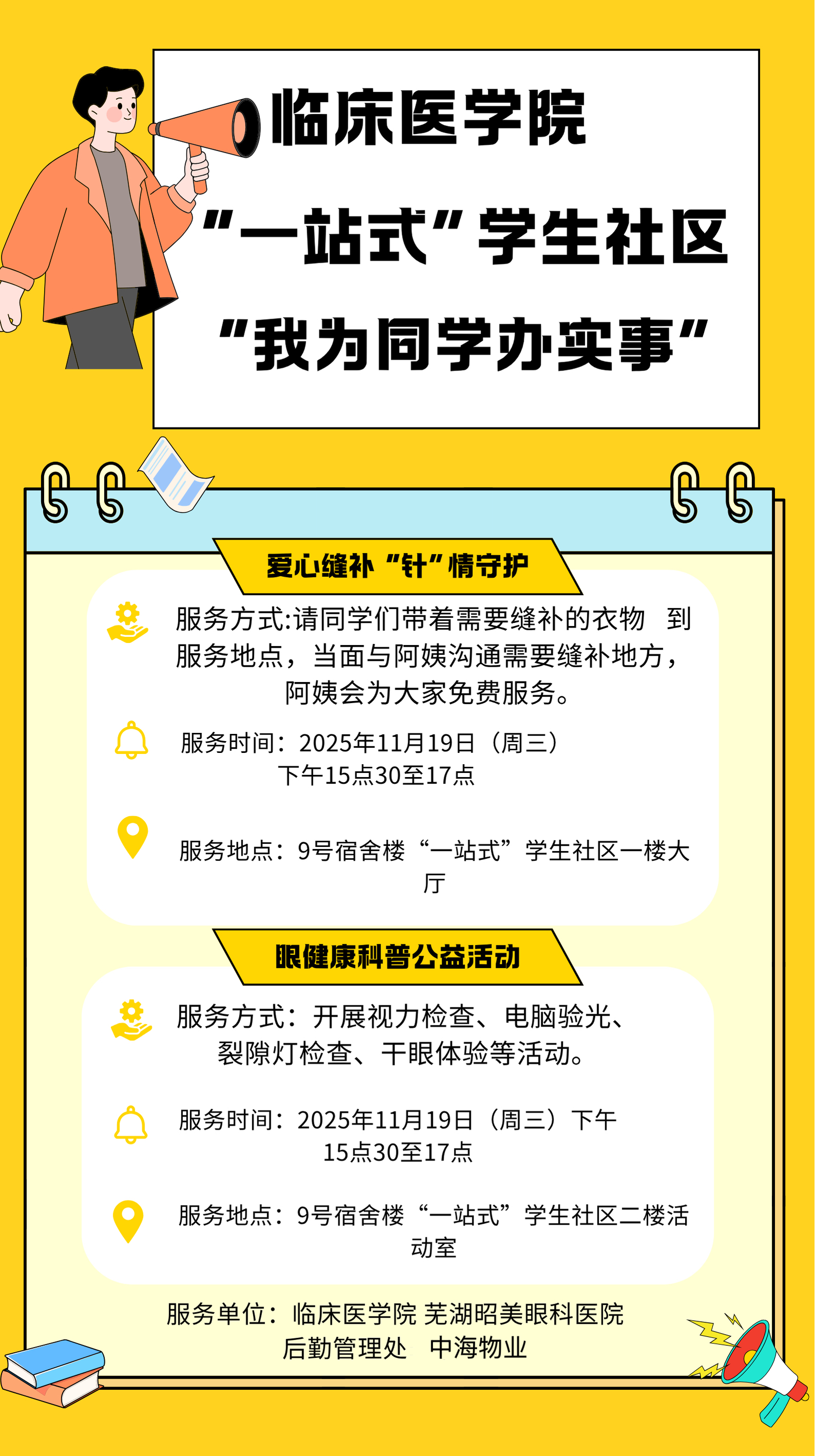 为深化“一站式”学生社区育人功能,聚焦学生实际需求,11月19日下午,临床医学院联合后勤管理处、芜湖昭美眼科医院等在“一站式”学生社区组织开展爱心缝补与眼健康科普公益行动,以精准服务推动“我为同学办实事”走深走实。