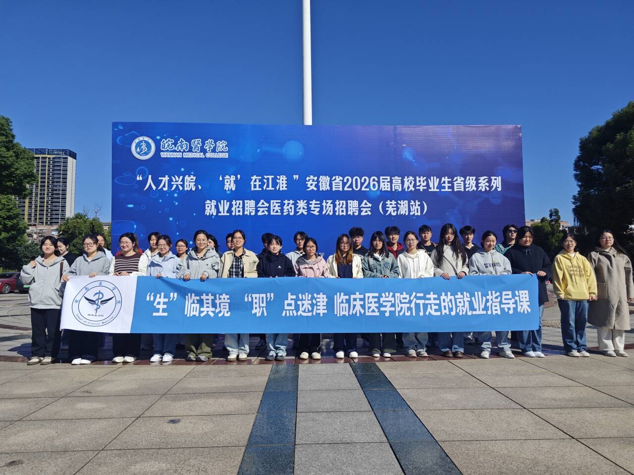 为帮助学生树立正确的就业观念,提前感受求职氛围,了解行业发展趋势合理制定职业规划,10月23日上午,临床医学院组织2024级临床医学和康复治疗学专业学生,走进“人才兴皖、‘就’在江淮 ”安徽省2026届高校毕业生省级系列就业招聘会医药类专场招聘会(芜湖站)现场开展就业实践。