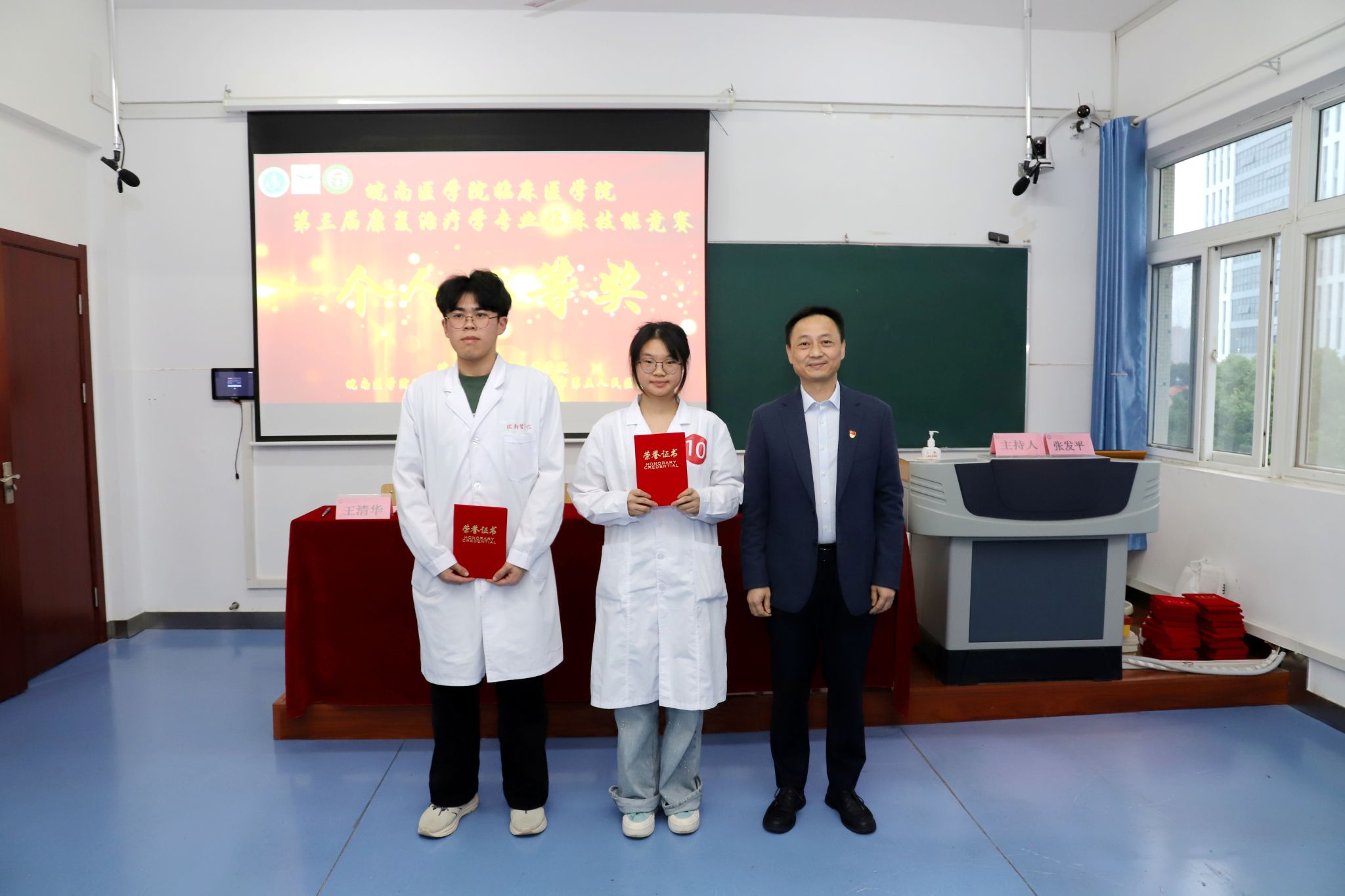 经过激烈角逐,最终符雨晴同学获得个人一等奖,韩庆楠、胡蓉等2位同学获得个人二等奖,荀美佳、高冉、张爽等3位同学获得个人三等奖;附属皖南康复医院第二代表队获得团体一等奖,第二附属医院代表队、附属皖南康复医院第三代表队获得团体二等奖,附属皖南康复医院第四代表队、附属太和医院代表队、芜湖市第一人民医院代表队获得团体三等奖;万兆兴、蒋婉云、王松、王纪涛、蒿飞等5位老师获评优秀指导教师,附属皖南康复医院获优秀组织奖。