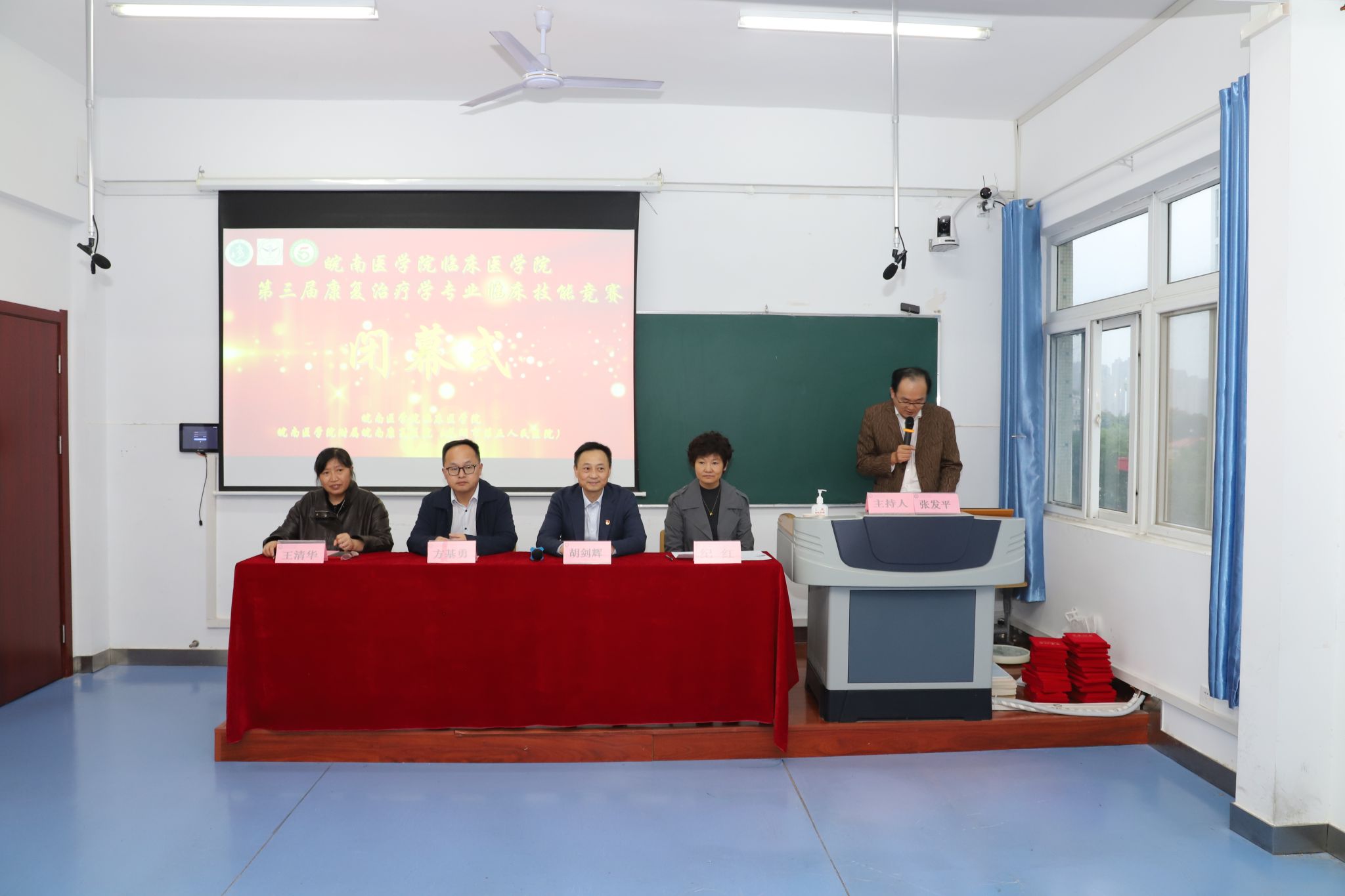 18日上午,在附属皖南康复医院7号楼技能中心举行开幕式。临床医学院党委书记方基勇,附属皖南康复医院党委副书记、院长徐茂奇,附属皖南康复医院副院长胡剑辉,安徽卫生健康职业学院教学主任杨芳,第一附属医院康复医学科主任王清华,附属太和医院(太和县人民医院)院长助理兼康复医学科主任蒿飞,芜湖市第一人民医院康复科主任纪红,附属皖南康复医院康复科主任张致亮,全体指导教师和参赛队员等参加开幕式。方基勇和徐茂奇分别致开幕词和欢迎词,杨芳作为裁判代表宣誓,王清华宣读赛场规则。开幕式由附属皖南康复医院科教部主任张发平主持。