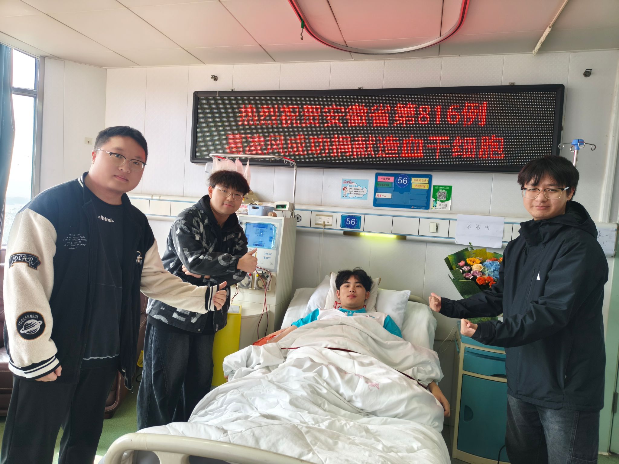 爱心接力,生命续航。10月27日,在我校第一附属医院造血干细胞采集室内,临床医学院2022级临床医学专业葛凌风同学平静地躺在病床上,鲜红的血液通过血细胞分离机缓缓流淌,历经近5小时采集,337毫升造血干细胞混悬液被成功分离。这份承载着生命希望的“火种”将为一名素不相识的血液病患者点燃重生之光。葛凌风同学成为我校在校生第8例、安徽省第816例造血干细胞捐献者。