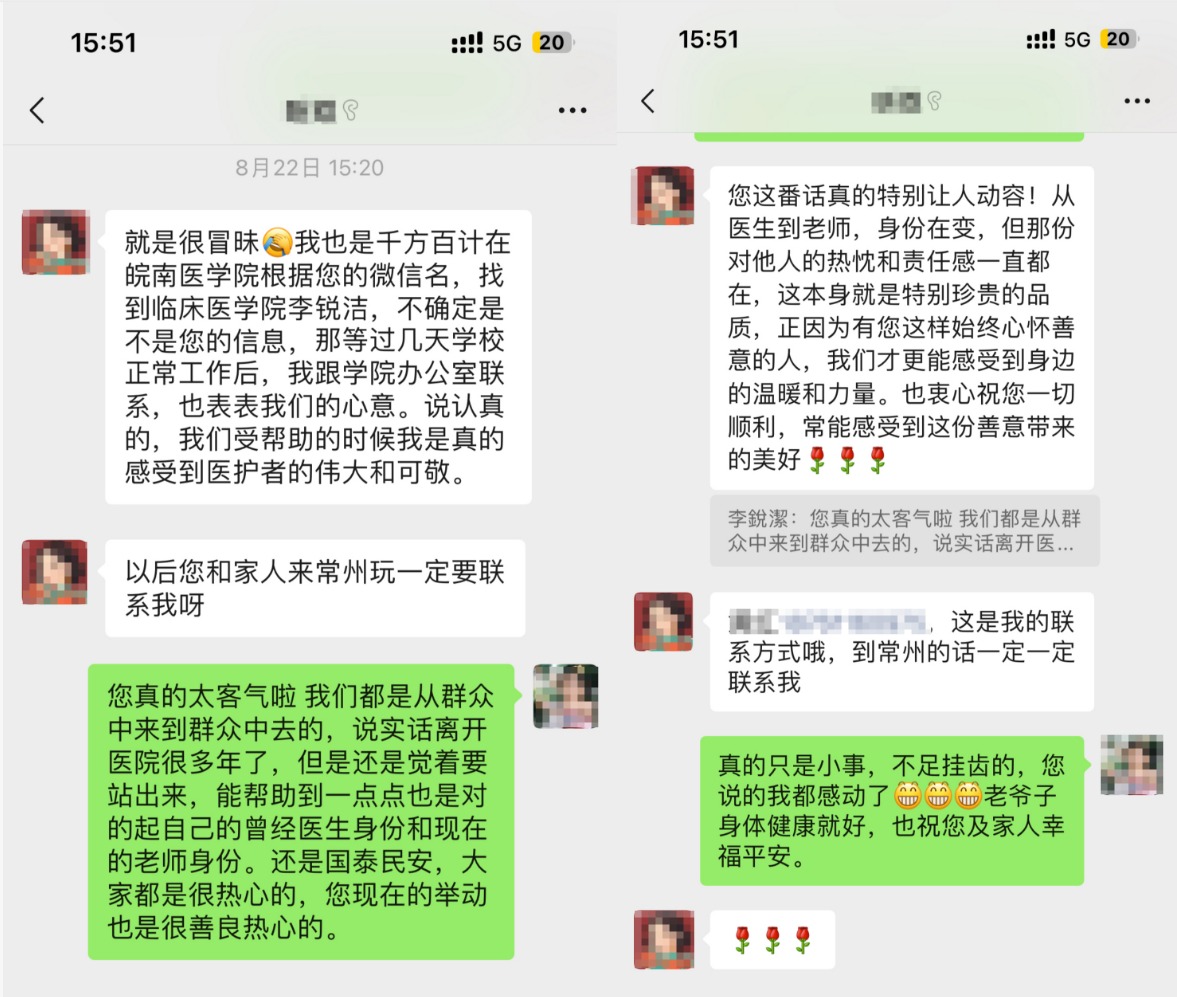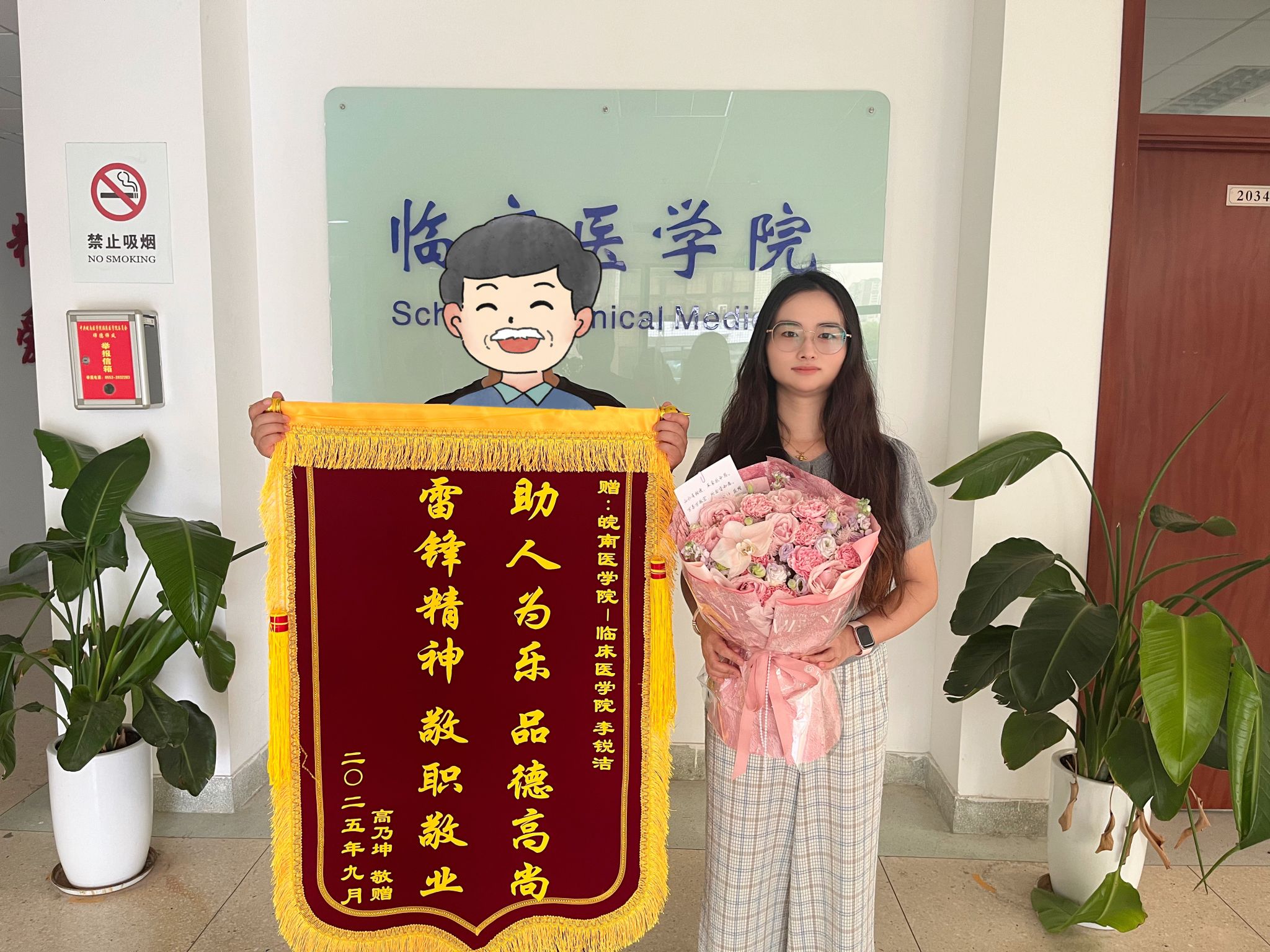 事后,经过多方寻找,老人家属联系上李锐洁,多次提出要赠送礼品以表感谢,均被其婉言拒绝。她表示,“曾经我是一名医生,现在是一名教师,更是一名中共党员,看到有人需要帮助,伸手相助是应该做的事,不用这么客气。” 为了进一步表达心意,家属特意拨通临床医学院的电话,详细讲述了李锐洁紧急救助的全过程,言语间满是感激;随后还专程送来鲜花与锦旗,向学校培养出这样品德高尚、专业过硬的教师表示敬意。