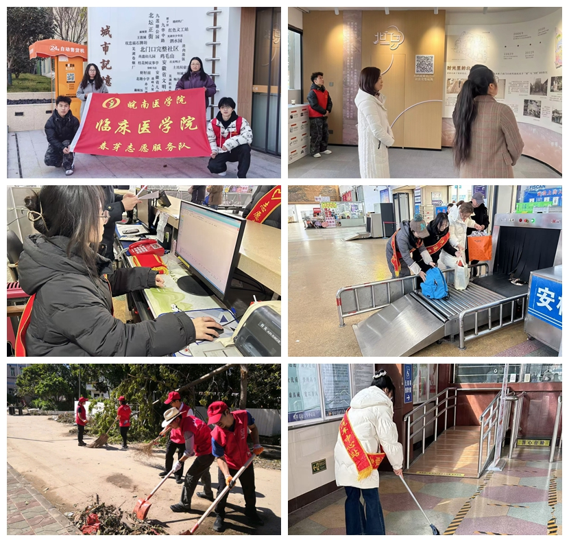 在城市建设的点滴中,“春芽”志愿者们的身影同样活跃。他们奔赴蚌埠市汽车站,协助旅客购票、搬运行李,为春运增添一份温暖;走进芜湖市北门口社区城市记忆馆,担任值班讲解员,讲述城市发展故事,传承文化记忆;拿起扫帚、铁锹,参与街道清扫,用实际行动美化城市环境。无论是车站的人流中,还是社区的巷陌间,同学们都以饱满的热情投入服务,用青年担当让“志愿红”成为冬日城市里最温暖的底色。